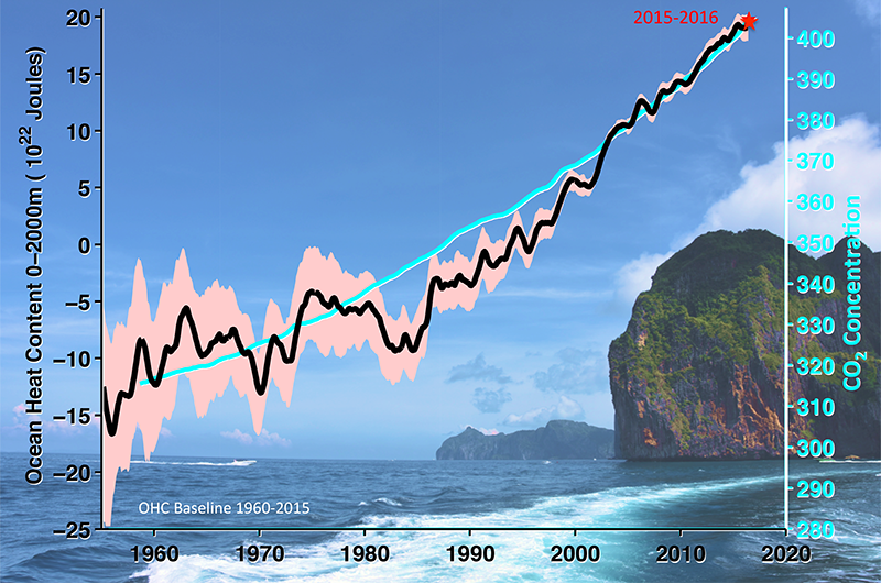Fig. 1. Ocean heat content (OHC) and atmospheric carbon dioxide (CO2) concentration measurements since 1958, shown as 12-month running means. The black line represents ocean heating for the upper 2,000 meters of ocean, and light red shading represents the 95% confidence interval. CO2 concentration observed at Mauna Loa Observatory is displayed by light blue. Mean values for 2015–2016 are highlighted with a red star. The OHC is relative to a 1960–2015 baseline. Ocean heat data are from Cheng et al. [2017], and CO2 information is from the National Oceanic and Atmospheric Administration.